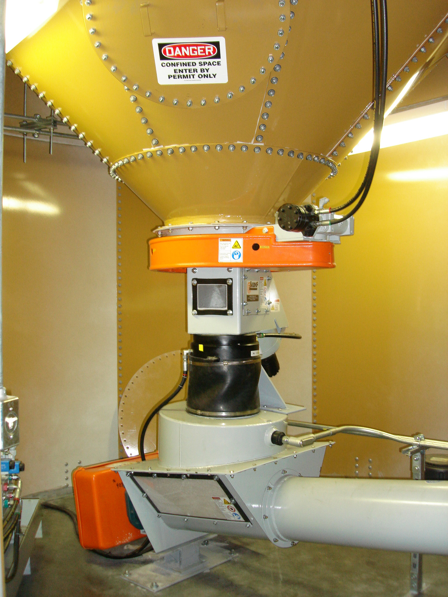 Materials such as grains, coal, pet coke, wood pellets, canola pellets and meal pellets can be removed after gravity drain is complete from a flat floor storage unit.